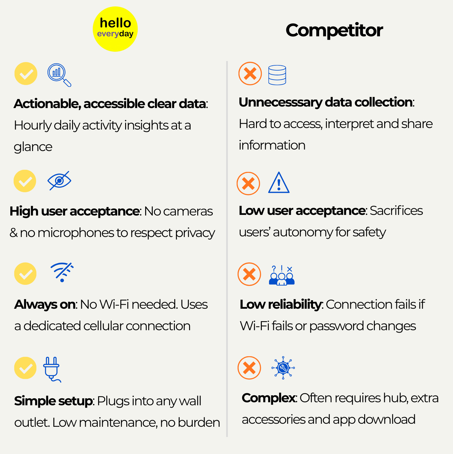 It's not surveillance. It'No camera, no voice monitoring, no charging, no app, no Wi-Fi and no password to remember.